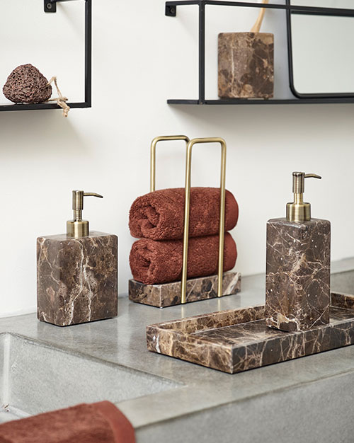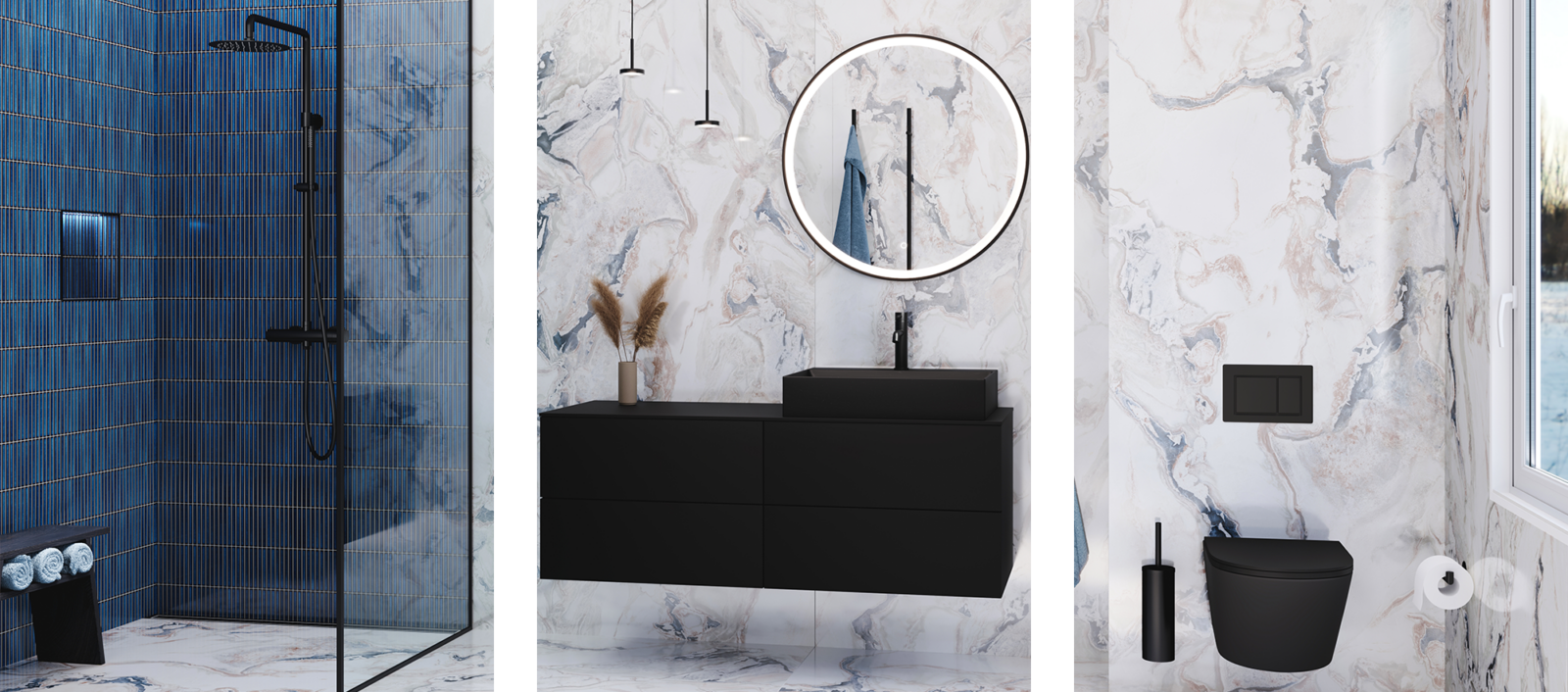 Et badeværelse med marmorlook, mørke detaljer og dybblå nuancer skaber en elegant og moderne oase – hvor æstetik og afslapning går hånd i hånd