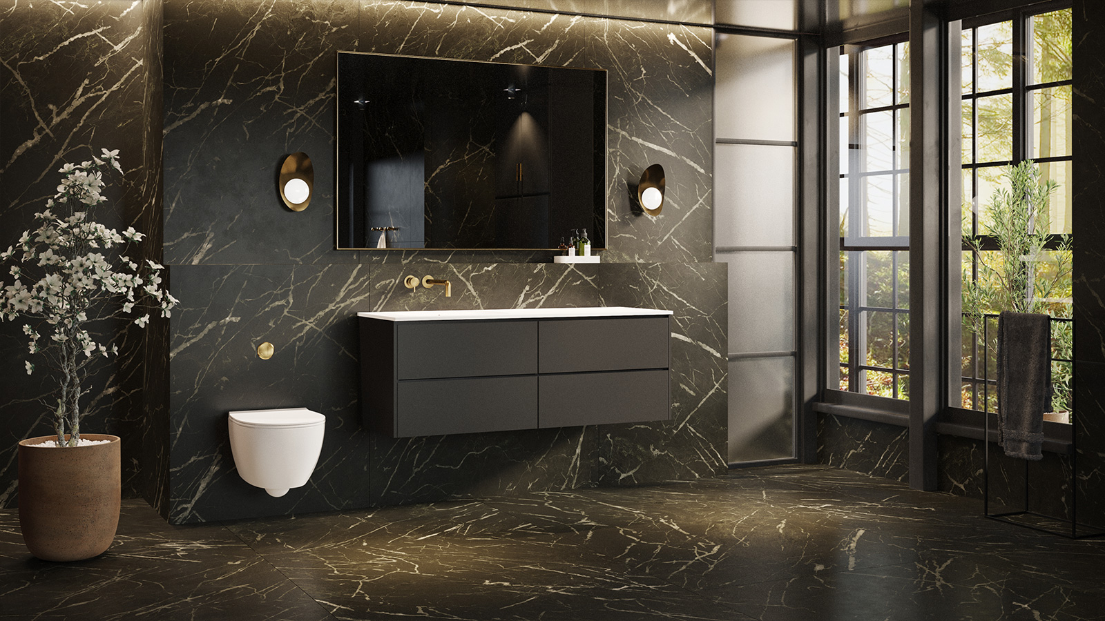 Et badeværelse med marmorlook, mørke detaljer og dybblå nuancer skaber en elegant og moderne oase – hvor æstetik og afslapning går hånd i hånd