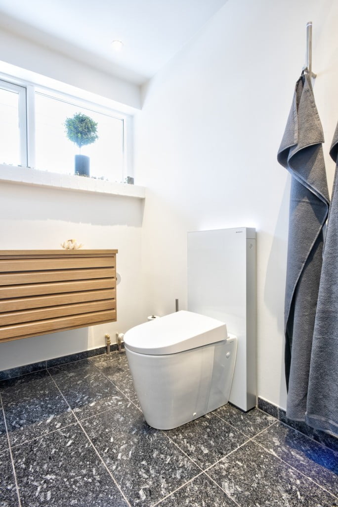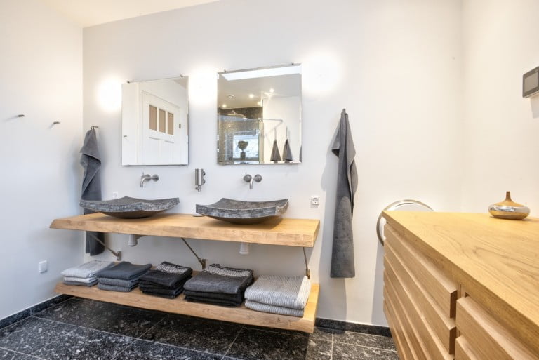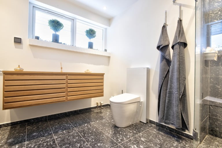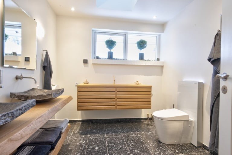 Det endte med at blive et meget unikt badeværelse. Det er ikke så tit, at jeg har kunder, der vælger både fliser og vask i granit. Det gav rummet det ønskede rustikke look, samtidig med at møblerne i træ gav den eksklusiv følelse.