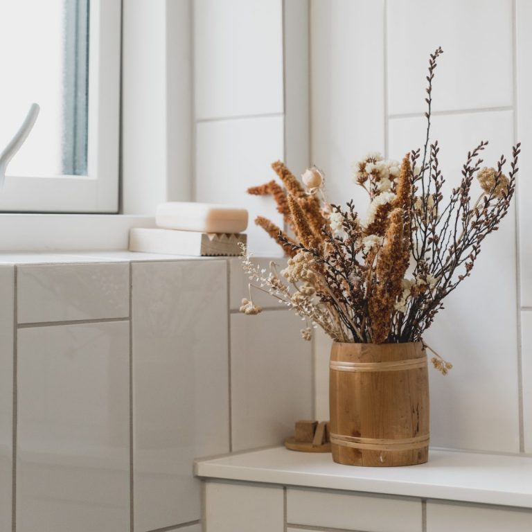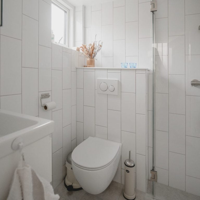 Det særlige ved dette rum, er dog at måden fliserne på væggen er lagt på er lidt unikt, i forhold til hvordan man typisk ville gøre det. Hvor de her er lagt på tværs forskudt af hinanden, hvilket giver et lille twist til de klassiske hvide fliser.