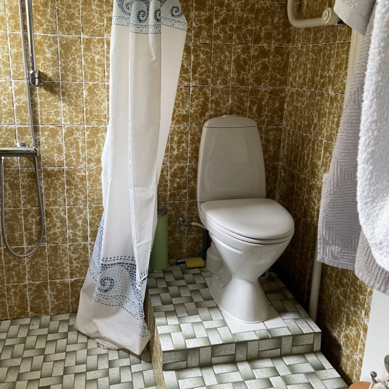 Badeværelset var præget af 70’er fliser, som de færreste ville vælge i dag. Stemningen var tung og rummet var på igen måde indbydende. Toilettet stod paf uvisse årsager på en piedestal, og trængte ligeledes til en opgradering.