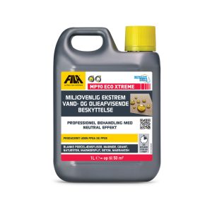 Nu står dine naturstensfliser rene og pæne. Næste step er at få dem imprægneret. Vi anbefaler, at du bruger MP90 Eco Extreme, der er et vandbaseret pletbeskyttelsesmiddel udviklet til imprægnering af natursten. Det nedsætter materialets absorbering og beskytter flisen uden at ændre udseende.