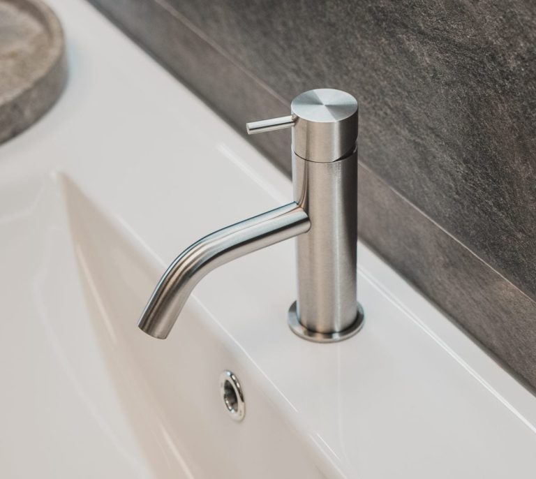 Alle armaturer på begge badeværelser er af mærket Revolution i rustfrit stål. Produkterne kommer i 21 overflader, så uanset om du er til krom, stål eller noget helt andet, kan du få det hos Bad & Fliser. 13 af farverne fås i PVD-overflader, som holder længere og ikke får patina.
